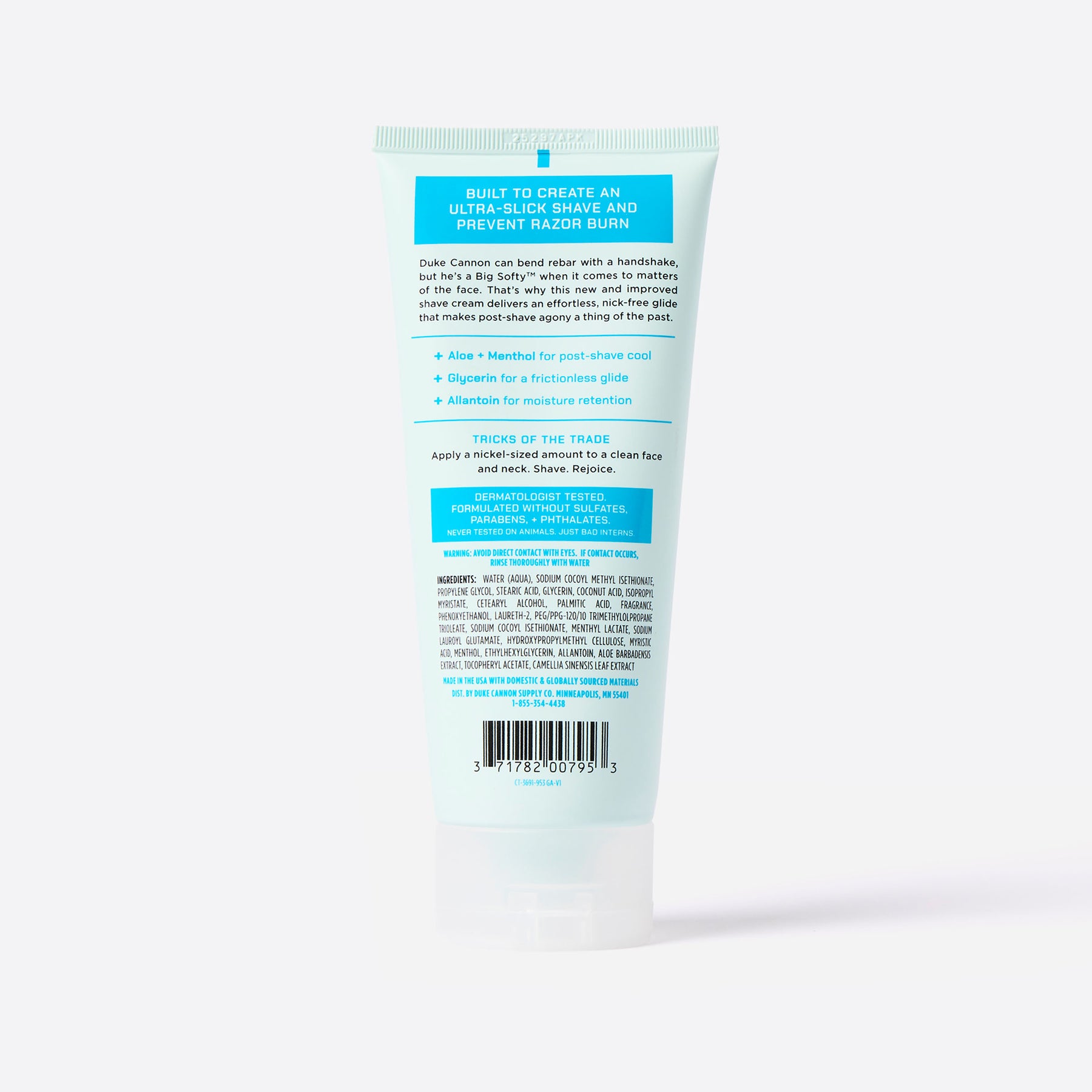 Duke Cannon can bend rebar with a handshake, but he's a Big Softy™ when it comes to matters of the face. That's why this new and improved shave cream delivers an effortless, nick-free glide that makes post-shave agony a thing of the past.
