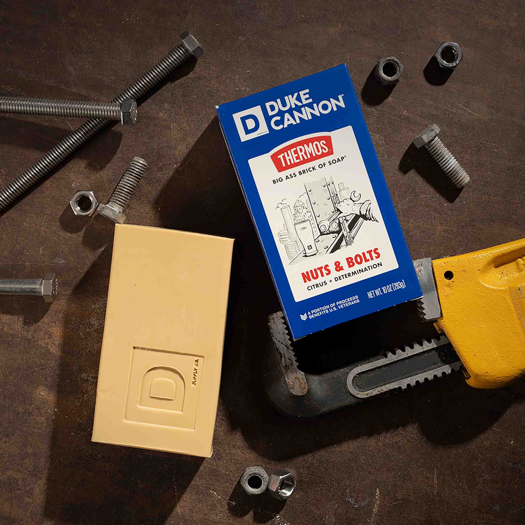 Duke Cannon doesn't need an ergonomic desk chair or a fancy sparkling water machine to take care of business. A hefty wrench, a tough Thermos® tumbler, and a fistful of Nuts & Bolts are all the "office amenities" he requires to turn any task into a triumph.