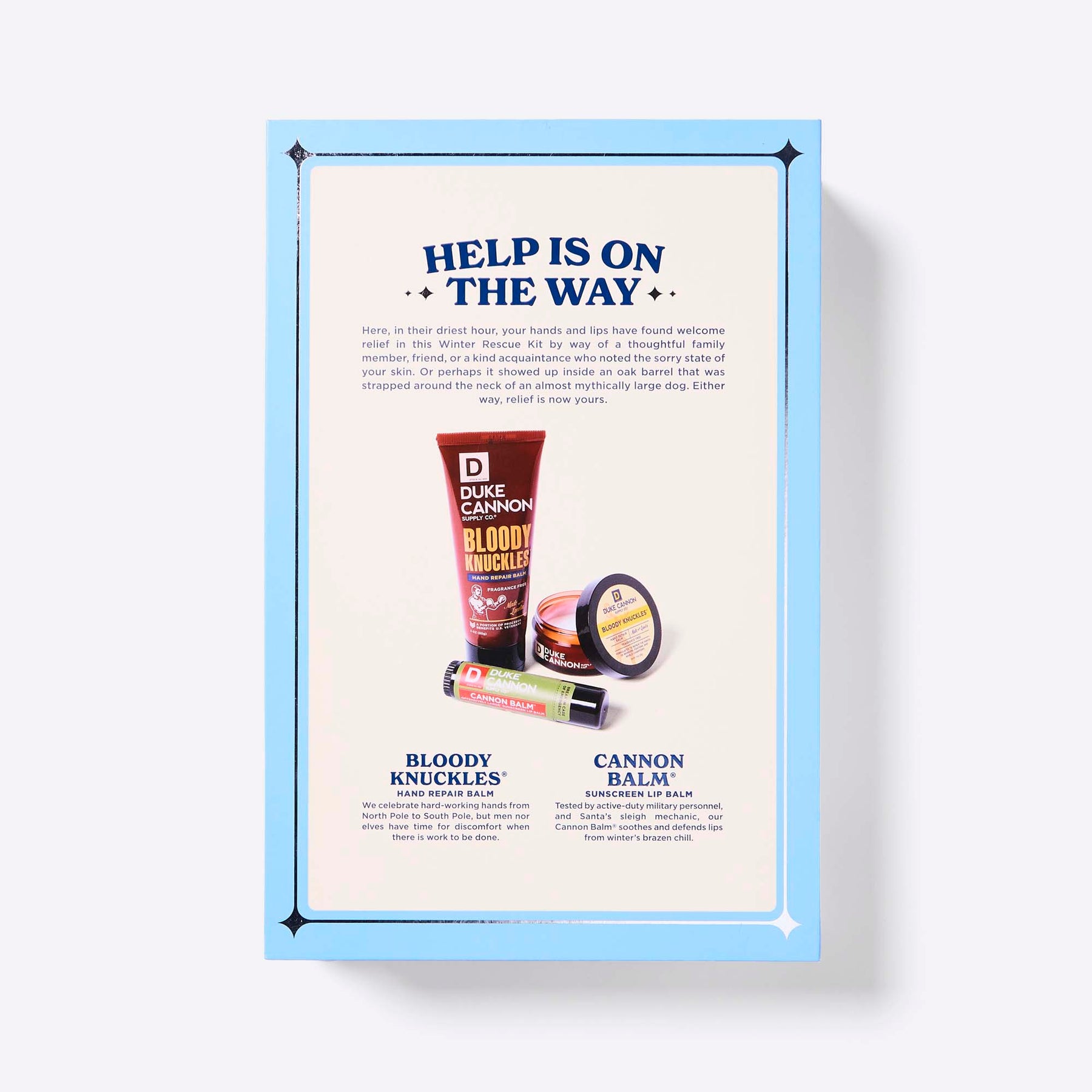 Here, in their driest hour, your hands and lips have found welcome relief in this Winter Rescue Kit by way of a thoughtful family member, friend, or kind acquaintance who noted the sorry state of your skin. Or perhaps it showed up tucked inside an oak barrel around the neck of an almost mythically large dog. Either way, consider your skin saved.